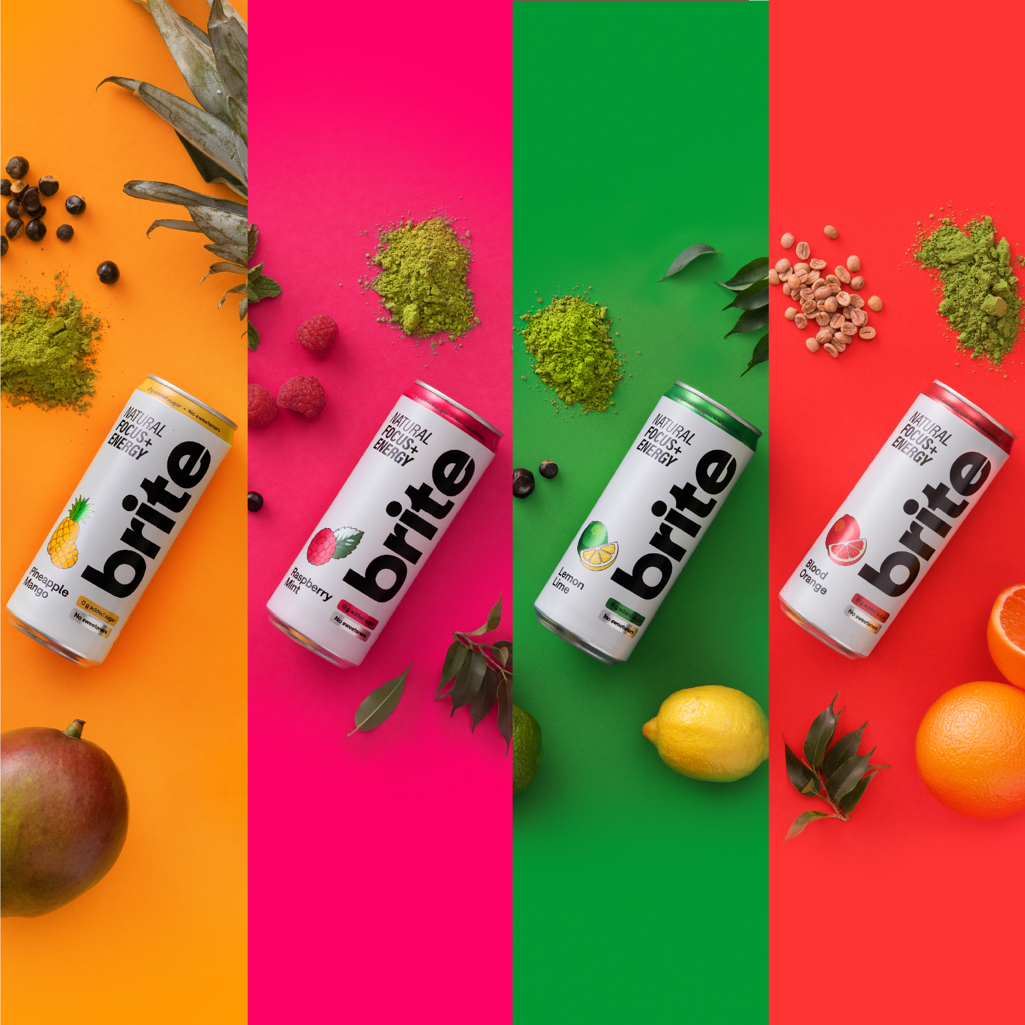 Blood Orange: natural extracts (green tea, green coffee beans, guarana), matcha tea organic ceremonial grade, fruit juice (apple, blood orange), natural flavourings, sparkling water